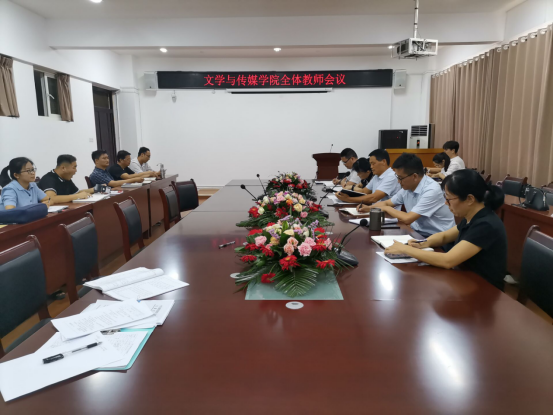9月15日下午2:30,文学与传媒学院在教A303召开全体教师工作会议,党委书记杨文艺,党委副书记、院长张德岁,副院长李娟,副院长满建,副书记刘影及全体教师参会。会议由张德岁主持。