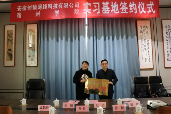 文学与传媒学院一行与安徽创翰网络科技有限公司秦总一行就合作事宜进行商谈,最终达成共识,签订实习协议并挂实习基地牌。