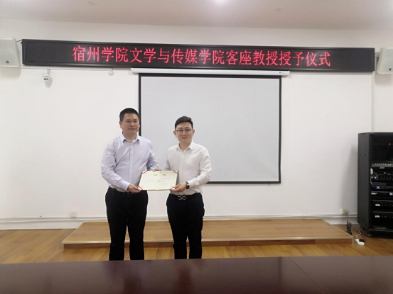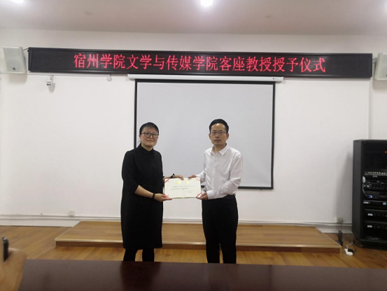 5月19日下午,文学与传媒学院客座教授授予仪式在教学楼A303室举行,周康乐、刘楚仁、秦奋、马盼盼四位专家受聘我院客座教授。文传学院党委书记杨文艺、副院长李娟、满建、党委副书记刘影出席仪式并颁发聘任证书,文传学院科级以上干部、教研室主任参加此次会议。仪式由文传学院副院长李娟主持。
