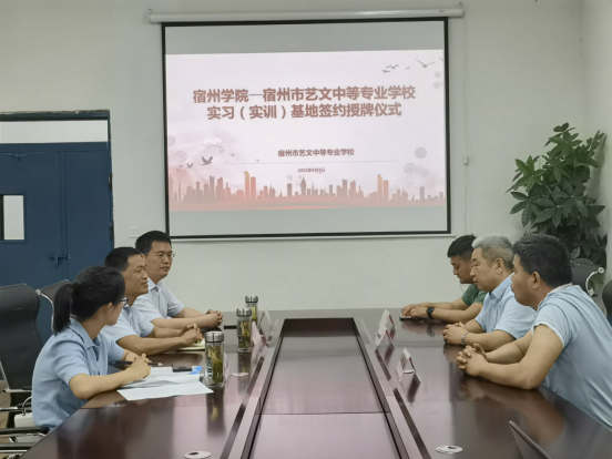 宿州市艺文中等专业学校副校长朱华就学校办学理念、专业设置行介绍。张院长就文学与传媒学院专业设置、人才培养目标等进行了介绍,宿州市艺文中等专业学校能够为我院学生更多的实习与就业机会,也希望双方今后在课程建设、人才培养方案修订、产学研合作等方面加强合作交流。