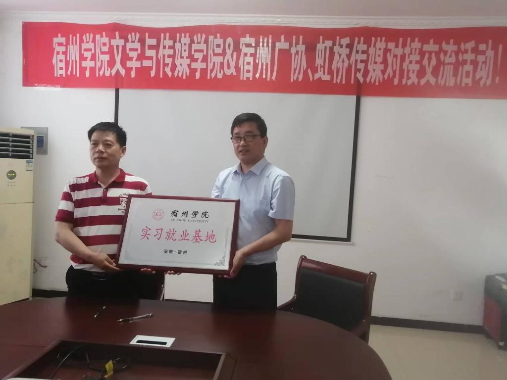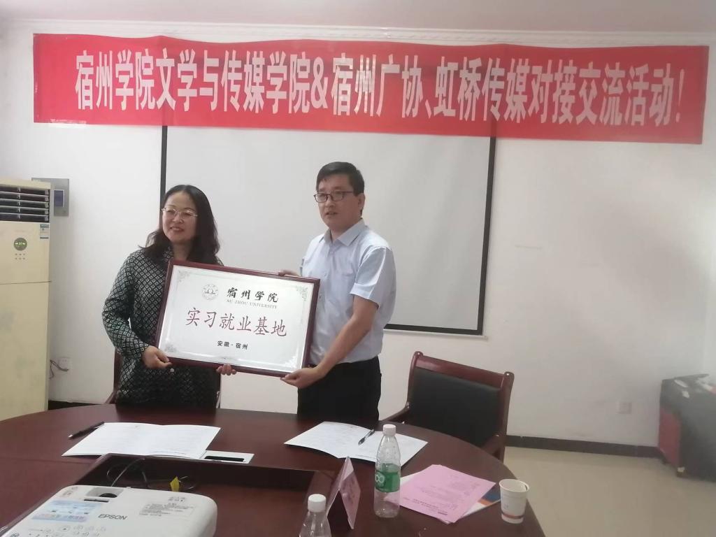 文学与传媒学院与宿州虹桥文化传媒有限责任公司、宿州金马装璜有限公司签订了大学生实习就业基地协议书,举行了校企合作实习基地授牌仪式。会议参会人员纷纷就加强校企合作进行了广泛深入的探讨,提出了各自的意见与建议,大家共同表示,企业和高校应不断加强沟通交流,建立常态化联系机制,打开共赢局面。