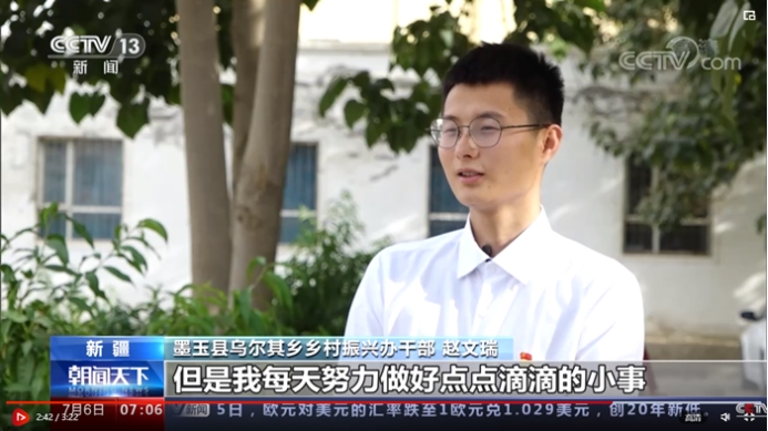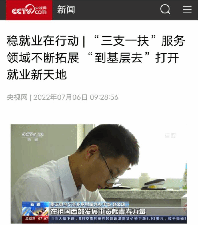 7月6日,中央电视台《朝闻天下》栏目,在“稳就业在行动”专题报道《“三支一扶”服务领域不断拓展 “到基层去”打开就业新天地》中,报道了我院2017级汉语言文学专业毕业的赵文瑞同学毕业后选择“三支一扶”计划,到远离家乡的新疆墨玉县贡献自己的青春力量的优秀事迹。《央视网》进行了转载报道。