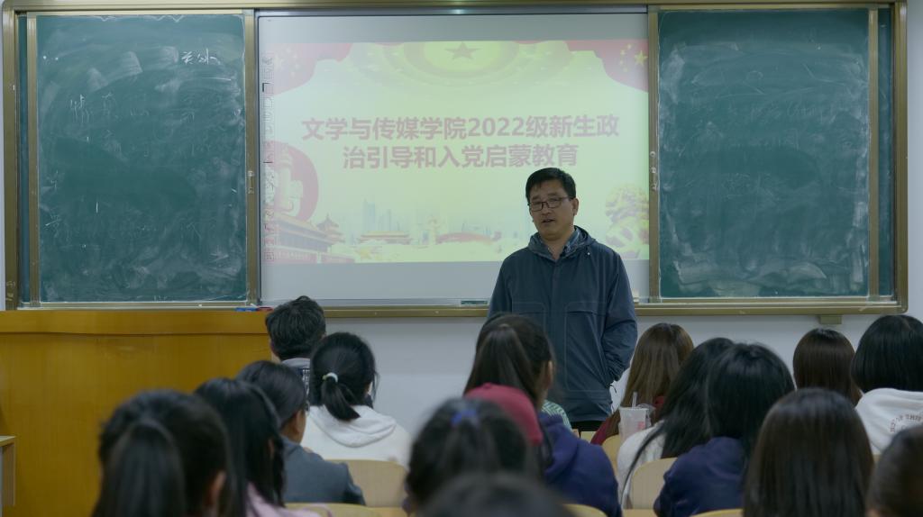 为加强2022级新生思想政治引领、引导新生积极向党组织靠拢,自觉争做新时代中国特色社会主义的坚定信仰者和忠实实践者,10月12日,文学与传媒学院在东教A412开展了2022级新生入党启蒙教育。学院党委书记杨文艺主讲,分团委书记王磊主持。新闻学学生党支部书记李雪玲及2022级全体新生参加了活动。