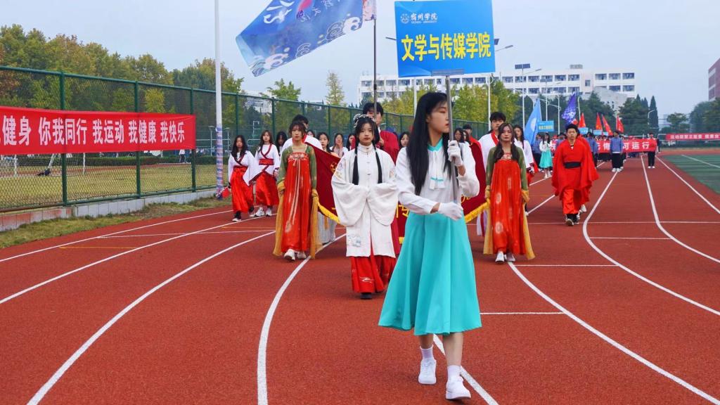 为展现当代大学生的青春风采,激发大学生参与体育运动的活力,2022年10月27日上午8时,文学与传媒学院参加宿州学院第十六届田径运动会开幕式。