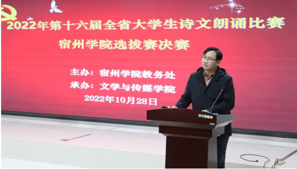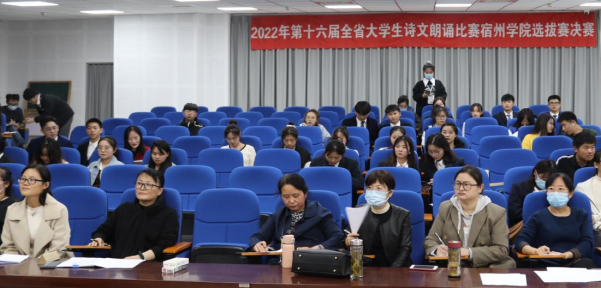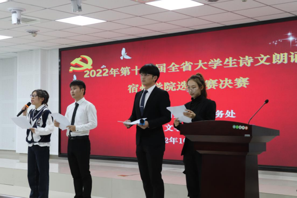 为热烈祝贺党的二十大胜利召开,歌颂党的百年光辉历程,展现举世瞩目的伟大成就,由宿州学院教务处主办,文学与传媒学院承办的2022年第十六届全省大学生诗文朗诵比赛宿州学院选拔赛决赛于10月28日在管理学院103报告厅举行。