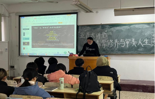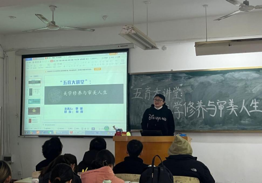 为深入贯彻全国第三次教育工作会议精神,进行高校美育教育,使学生“德、智、体、美”得到全面发展,提高学生的审美能力,培育学生的想象力,开发学生的创造力,提高学生的感知力、观看力、理解力,学会用心感受世界,健全人格,促进身心和谐进展,2022年12月5日下午3:30—4:30,文学与传媒学院于教学楼A312教室举办了“五育”双创大讲堂活动——美学修养与审美人生,由李娟教授主讲,汉语言文学专业学生参与。