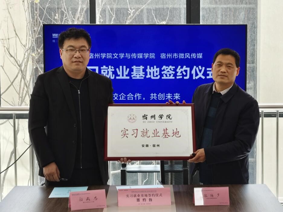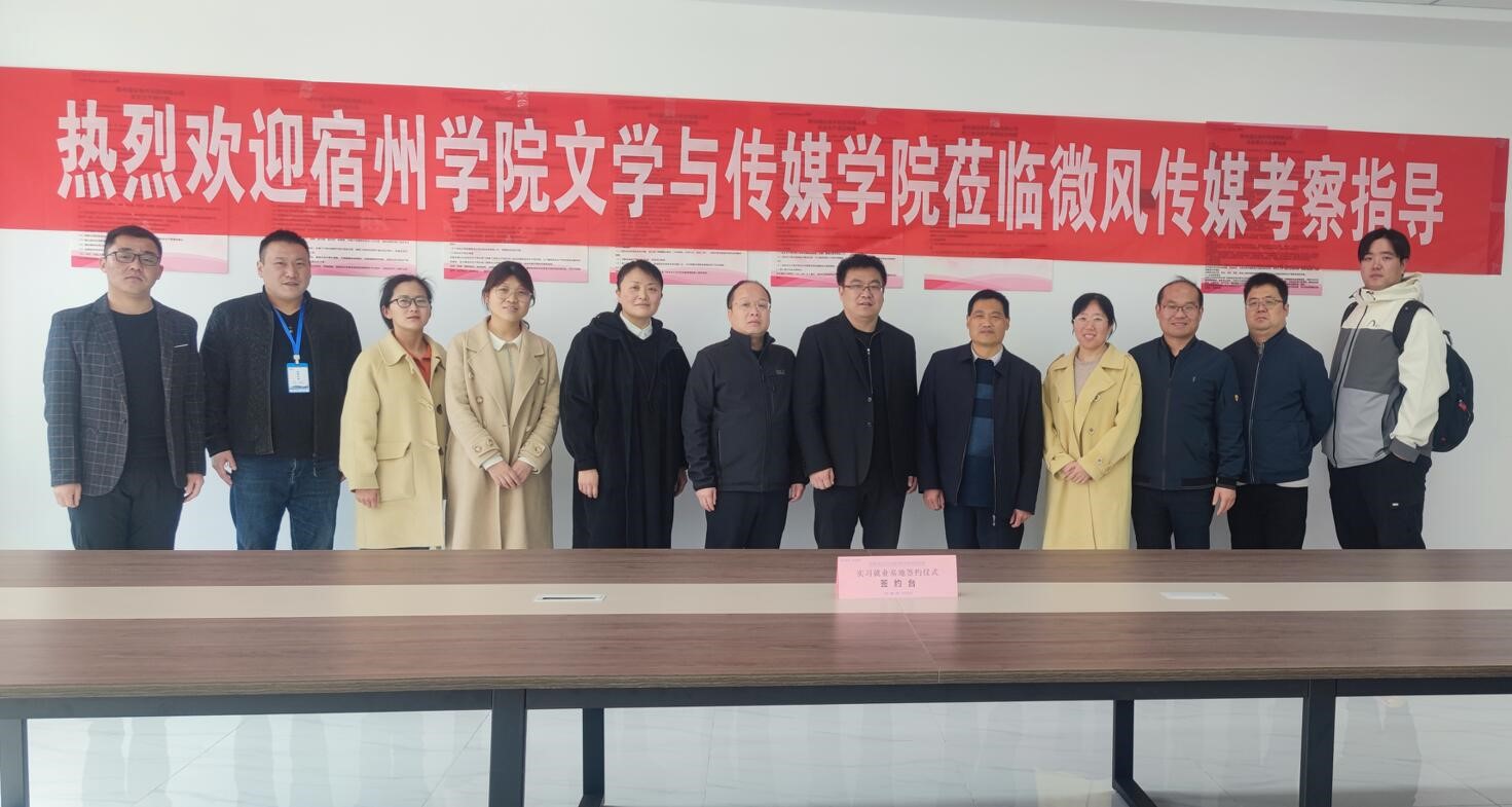为深入学习贯彻党的二十大精神,落实宿州市“4510”校地联合科创行动,进一步加强校企、校地合作、推进产业学院建设、推动高水平大学建设。3月28日上午,文学与传媒学院院长张德岁、副院长李娟、党委副书记刘影等一行赴宿州微风传媒公司开展校企对接和实习就业基地签约挂牌仪式。