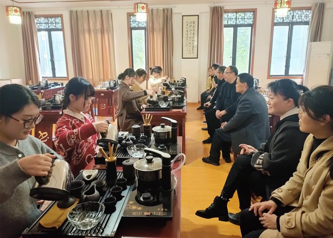 会前,在黄山学院文学院院长沈昌明的陪同下,我院一行参观了黄山学院文学院办学成果展示馆和实训场所,并到茶艺实训室观看了学生茶艺表演。