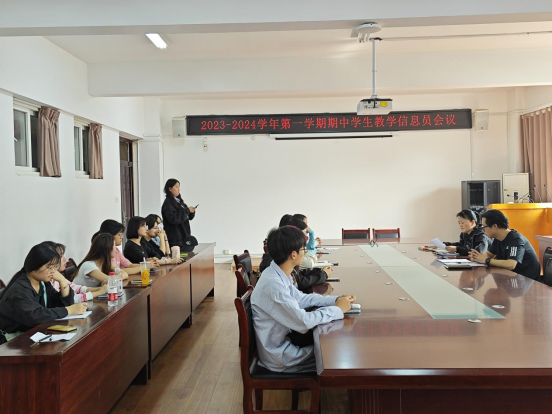 10月25日,2023—2024学年第一学期期中教学信息员会议在教学楼A303会议室召开。文学与传媒学院教学副院长李娟、教学秘书徐文斌及全体学生教学信息员参加了会议,会议由教学秘书徐文斌主持。