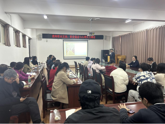 为深入贯彻党的二十大关于“重视心理健康和精神卫生”重要部署,加强人文关怀和心理疏导,涵养积极健康的社会心态,增强教职工的职业幸福感、归属感,11月22日下午,文学与传媒学院邀请音乐学院副教授、国家二级心理咨询师、家庭教育指导师吴枝兵在教学楼A303会议室举办“教师职业发展:职业倦怠与心理压力调适”主题讲座。文学与传媒学院党委副书记、院长李月云,党委副书记刘影,副院长李娟、满建以及全体教职工和部分学生代表参加了讲座,讲座由李月云主持。