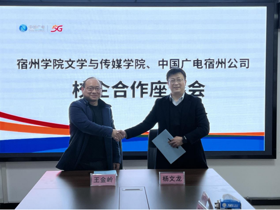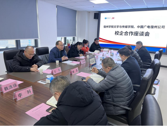中国广电宿州公司党委书记、总经理杨文龙及其领导班子成员热情接待我院一行。杨文龙从“学习强国”乡村大喇叭、新时代文明实践中心智慧云平台、“雪亮工程”、应急广播建设与维护、文化大数据等方面对公司情况进行介绍。杨文龙希望借助文学与传媒学院在师资队伍、视频内容制作等方面的优势开展产学研活动,实现资源共享,互利共赢。