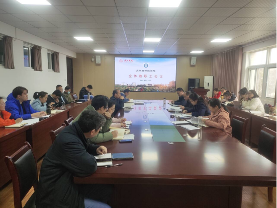 为加强学院管理,做细做实教学科研及服务学生等工作,3月14日,文学与传媒学院在教A303召开全体教职工会议,党委书记王金岭,党委副书记、院长李月云,党委副书记、纪委书记刘影,副院长满建及全体老师参会。会议由李月云主持。