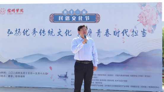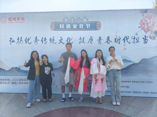 2024年5月15日,伴随着初夏的微风与明媚阳光,宿州学院第十一届民俗文化节盛大开幕。院领导李红、闵杰、王俊、杨维志、王红艳出席活动。此次民俗文化节不仅展示了中国传统民俗文化的博大精深,也彰显了学院在文化创意产业的积极探索,尤其是四位活跃于现场的文传学院留学生,他们的参与为活动增添了国际化的风采。