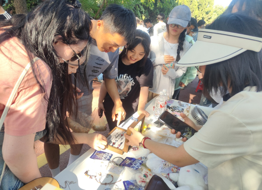 开幕式结束后,老师带领几位留学生漫步于各式各样的民俗摊位之间,这些摊位展示了中国传统手工艺的精髓。花鸟画摊位前,细腻的笔触和生动的画面让人驻足;糖画艺人则以糖为墨,在板上绘制出一幅幅栩栩如生的图案,引得众人围观。此外,宿州学院文创产品区域也成为了关注的焦点,各类创意十足的产品不仅体现了学院师生的创新精神,也将宿州学院的文化符号巧妙融入现代设计之中,展现了学院文化的独特魅力。留学生们,积极互动,亲手体验制作过程,与创作者们进行了交流,探讨设计理念与背后的文化故事。这一环节不仅是对民俗文化的直接触碰,更是文化实践课程理念的生动实践。负责留学生教育教学工作的李娟副院长表示:“通过将民俗节的体验融入日常的文化实践教学中,旨在让学生们不仅仅是在课堂上学习理论,而是亲身体验文化,感受其背后的故事与情感,这样的方式更能激发学生的学习兴趣和创造力。”