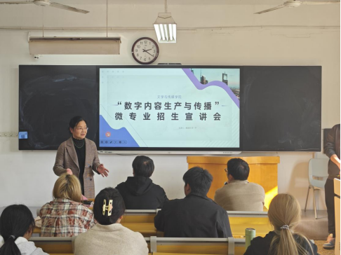 根据宿州学院“关于开展2024年微专业招生工作的通知”,2024年11月7日,文学与传媒学院在教学楼A313教室召开数字内容生产与传播微专业招生宣讲会。文学与传媒学院院长、数字内容生产与传播微专业负责人李月云,专任教师魏逸扬、邵一平,教学秘书徐文斌及2022级、2023级新闻学专业、文化产业管理专业和网络与新媒体专业学生参加了宣讲会。