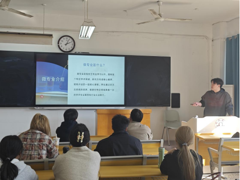 此次宣讲会由魏逸扬主讲,他首先对“微专业”的概念进行了介绍,然后结合招生简章和培养方案对我院数字内容生产与传播微专业的培养目标、课程结构、师资情况、招生办法、报名方式等进行了逐一介绍,并与学生积极互动,为学生答疑解惑。