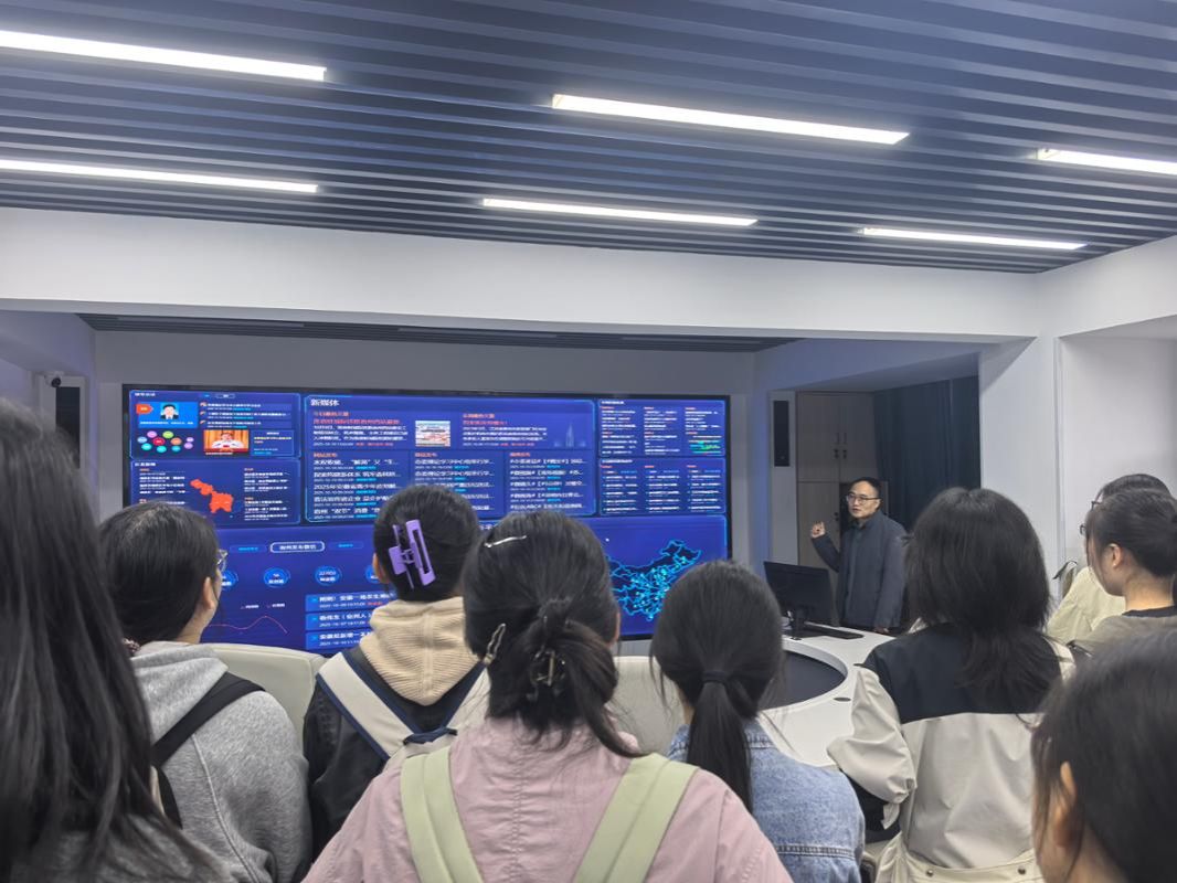 随后,师生们移步至拂晓报社融媒体中心,实地探访现代新闻生产的“中枢神经”。融媒体中心负责人李锋老师为师生讲解并演示了智新媒体大数据平台的运作流程。该平台集线索发现、影响力分析、传播分析、运营数据等板块于一体,充分展示了大数据、人工智能等先进技术如何有效赋能新闻生产的策、采、编、发、评全流程。面对高效、精准、智能化的融媒生产体系,同学们表现出浓厚的兴趣,直观理解了媒体深度融合背景下,技术驱动对于新闻传播模式创新与效能提升的关键作用。