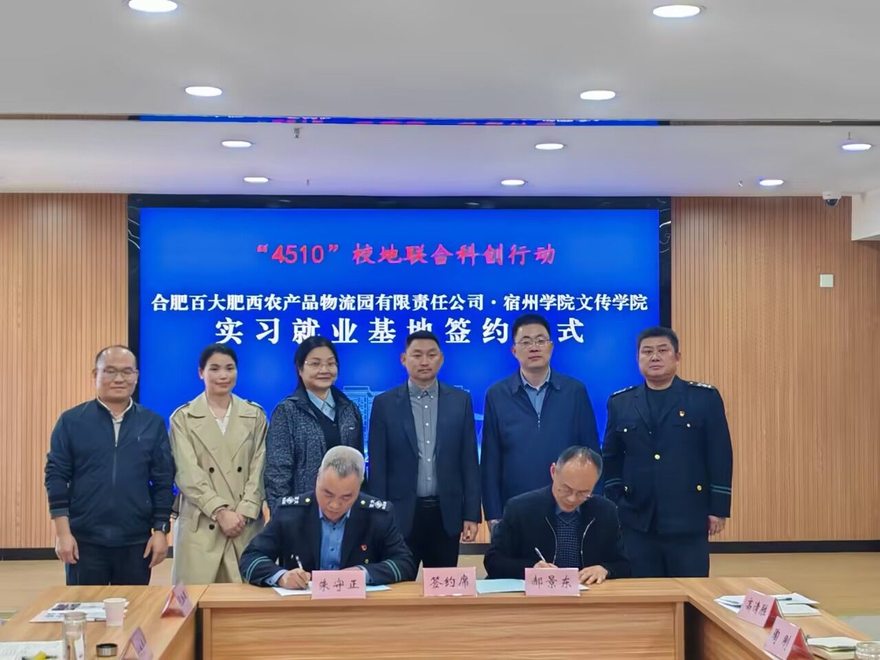 11月13日下午,文学与传媒学院党委书记郝景东、院长李月云、团委书记王磊以及辅导员张珈珲一行4人,赴合肥百大肥西农产品物流园有限责任公司开展访企拓岗暨实习实训基地签约活动,合肥百大物流园执行董事杨铭李、副总经理朱守正等领导热情接待并召开座谈会,我院优秀校友、肥西县严店镇党委书记汪胜杰陪同出席活动。