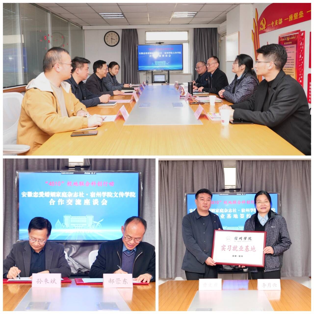 随后,在安徽恋爱婚姻家庭杂志社,安徽省妇联宣传部一级调研员、恋爱婚姻家庭杂志社党支部书记孙来斌带领团队成员对学院领导一行表示热烈欢迎。座谈会上,孙来斌对杂志社的发展状况、人才需求等方面进行了介绍,并特别感谢宿州学院近年来不断为杂志社输送优秀人才。参加座谈的三位文传学院的校友,杂志社的副总经理曹文虎、服务部主任许恩典和服务部编辑刘松凯分别汇报了各自的工作情况,并对学院的培养和教育表达了感恩之情。郝景东介绍了宿州学院的基本情况和发展目标,李月云介绍了学院的专业设置、人才培养特色、学生发展与就业意向等。双方围绕产教融合、校媒共建、就业实习、人才培养等内容深入交换意见。最后,双方就共同建立校企合作关系达成共识,签订了合作协议,并举行了“宿州学院大学生实习就业基地”授牌仪式。