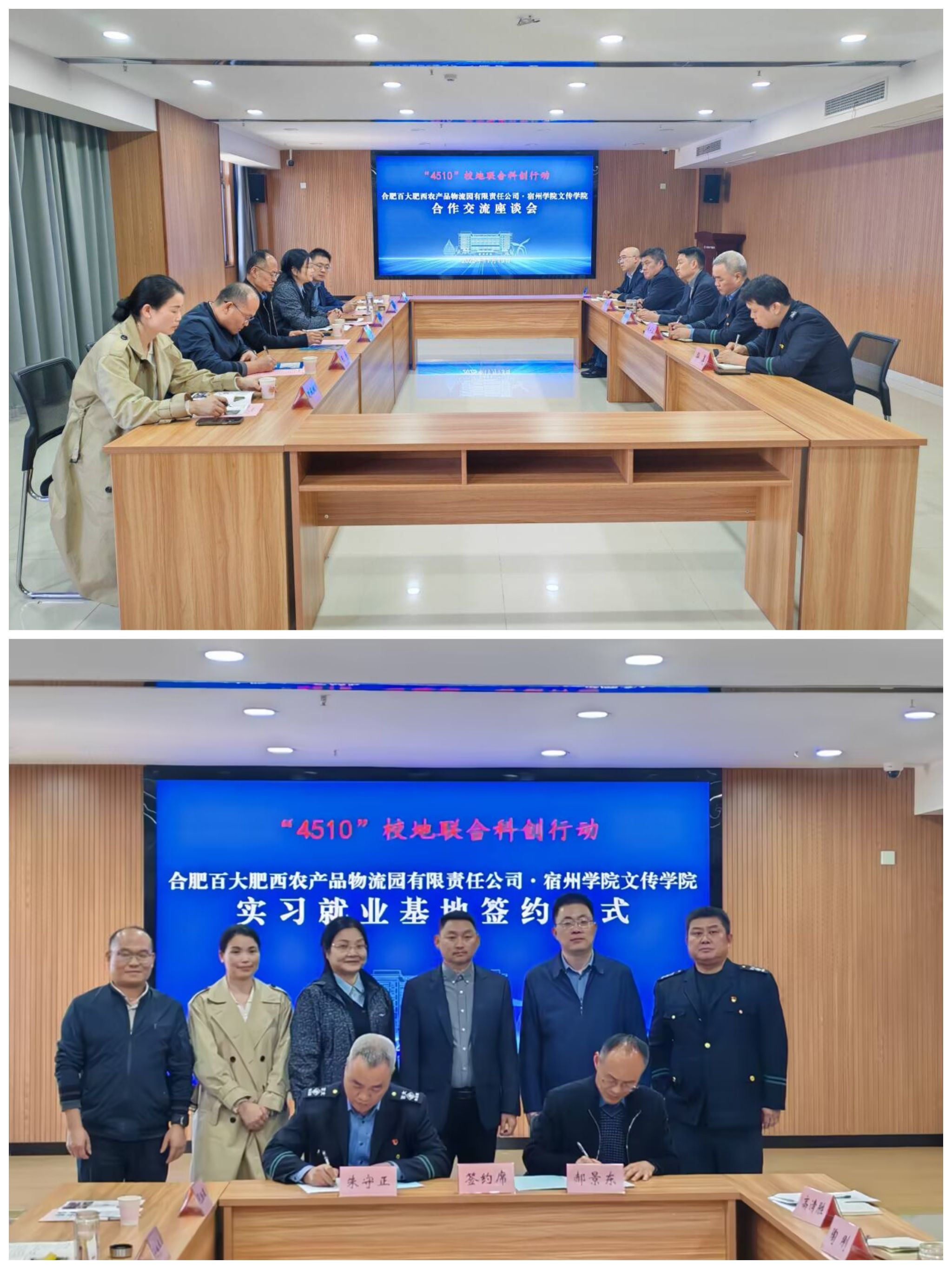 学院领导一行首先来到合肥百大肥西农产品物流园有限责任公司开展访企拓岗暨实习实训基地签约活动,合肥百大物流园党委书记、执行董事杨铭李和党委副书记、副总经理朱守正等领导热情接待并召开座谈会,学院优秀校友、肥西县严店镇党委书记汪胜杰陪同出席活动。会上,公司负责人介绍了企业的业务板块、人才需求等方面,学院领导介绍了学院概况、专业特色以及人才培养过程中的实践需求。双方针对校企合作方向展开交流探讨,并就共同建立校企合作关系达成共识,签订了校企合作共建实习(实训)就业基地协议。
